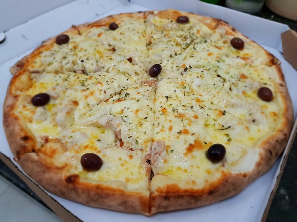 Molho de tomate fresco, mussarela especial, atum sólido, Champions fatiado, orégano e azeitonas pretas